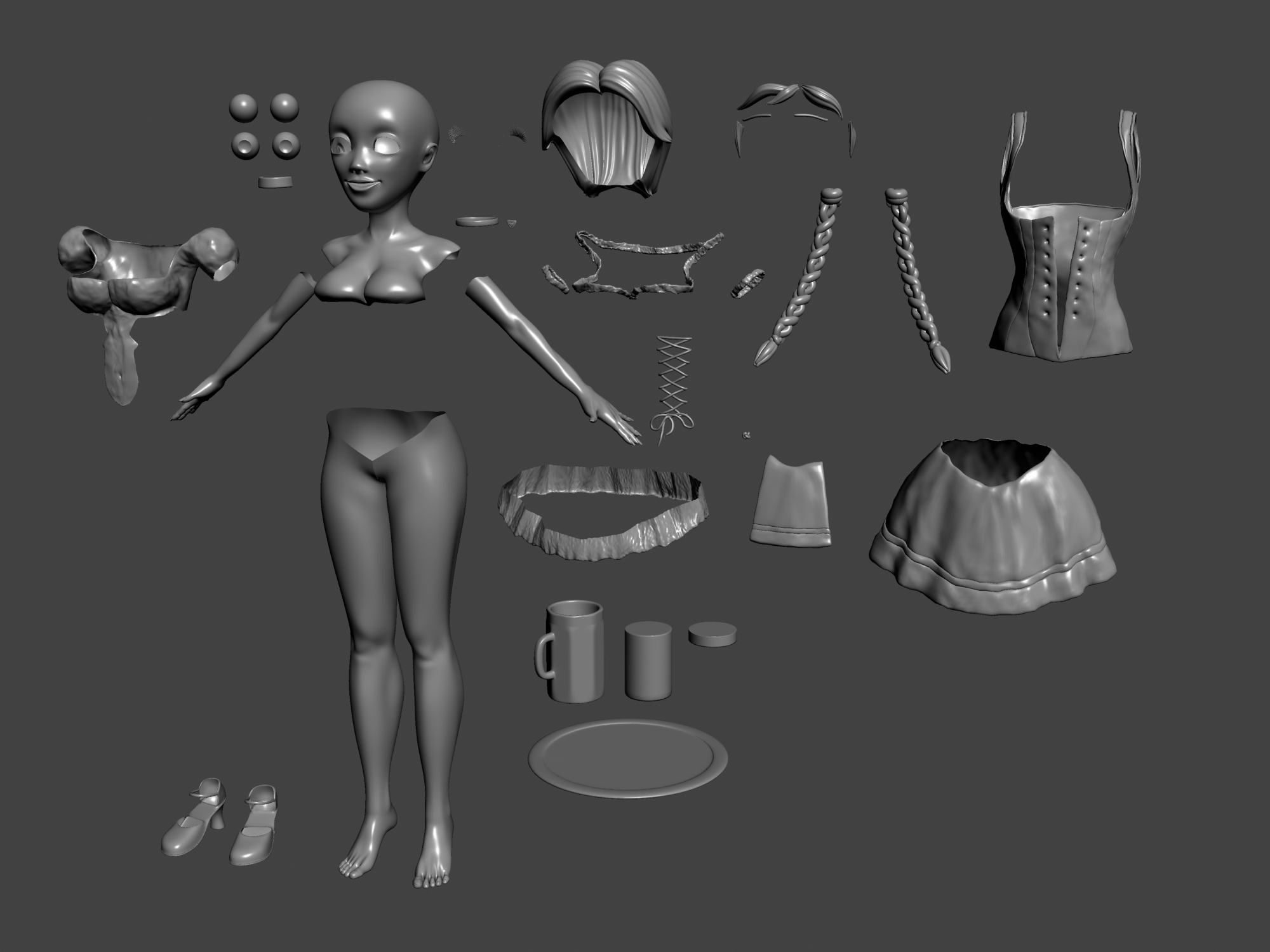 Usei o 3ds Max para criar os modelos, como você pode ver a seguir, e fiz todas as peças separadamente para que eu pudesse mudar facilmente o estilo de qualquer um dos acessórios. Cada peça modelada também recebeu seu próprio link ou skin modifier.