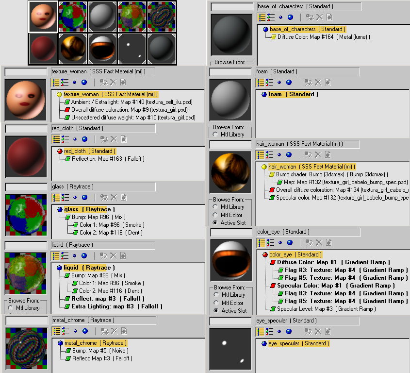 Abaixo você pode ver os principais materiais que usei para a garota. Também era importante equilibrar os materiais com as luzes da cena. Eu sempre gosto de ter pelo menos quatro luzes em uma cena: uma luz traseira para produzir o contorno forte, ajudando o material da sub-superfície a funcionar, uma esquerda e uma direita com temperaturas diferentes; e uma luz principal para produzir sombras e destacar áreas.