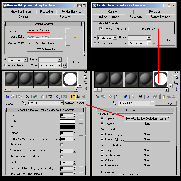 No 3ds Max, basta entrar na substituição do material, colocar um material de raio mental com uma oclusão na superfície e você poderá ter sua imagem de oclusão! Basicamente, usei o Mental Ray para ter a iluminação global de uma luz do céu e ter a imagem de oclusão para os pós-efeitos.