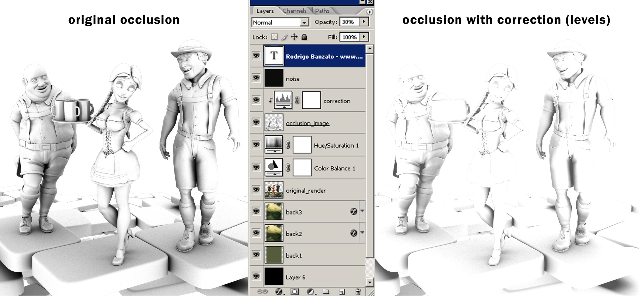 Veja agora como eu ajustei essa passagem de oclusão no Photoshop. A imagem final terá isso como uma camada Multiply na parte superior.