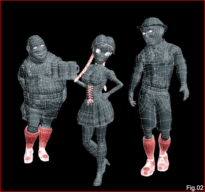 Este próximo trabalho foi feito para uma imagem estática, mas se eu tivesse feito uma animação, provavelmente teria que corrigir as áreas mostradas em vermelho na estrutura de arame. Por exemplo, as estrias do cabelo poderiam ter sido convertidas em modelos de baixo poli, e a mesma estria poderia então ser usada como um osso para o cabelo. Usei um modificador FFD no Max para corrigir algumas proporções dos sapatos, então desmoronei e os coloquei para usar o modificador de pele.