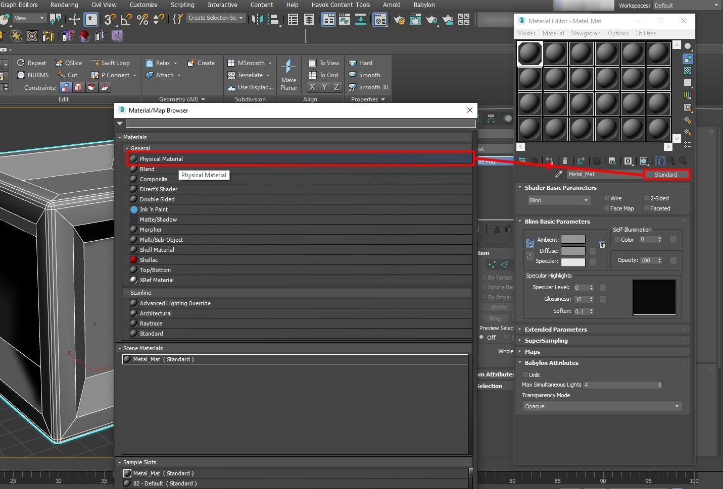 - No editor de material, clique na guia Padrão e, no navegador de material/mapa exibido, selecione Material Físico. Essa ação converterá o material Padrão atribuído em um Material Físico PBR.