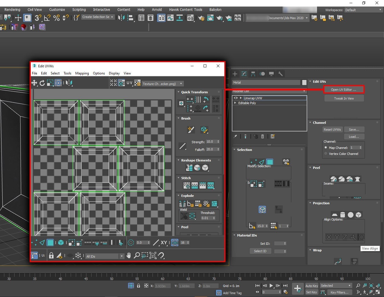 Observação: Mesmo que você tenha copiado (Movido) o desempacotamento de UV do canal 1 do mapa para o canal 2 do mapa, você pode fazer as edições necessárias nos novos UVs do canal sem afetar o canal do mapa original.