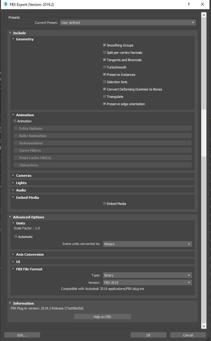 Importante: Se o arquivo FBX resultante for maior que 2,4 GB, a versão mínima das configurações de exportação do FBX (veja acima) deverá ser 2016 ou mais recente. Como as versões mais recentes têm suporte a 64 bits e, portanto, dão suporte a arquivos maiores.