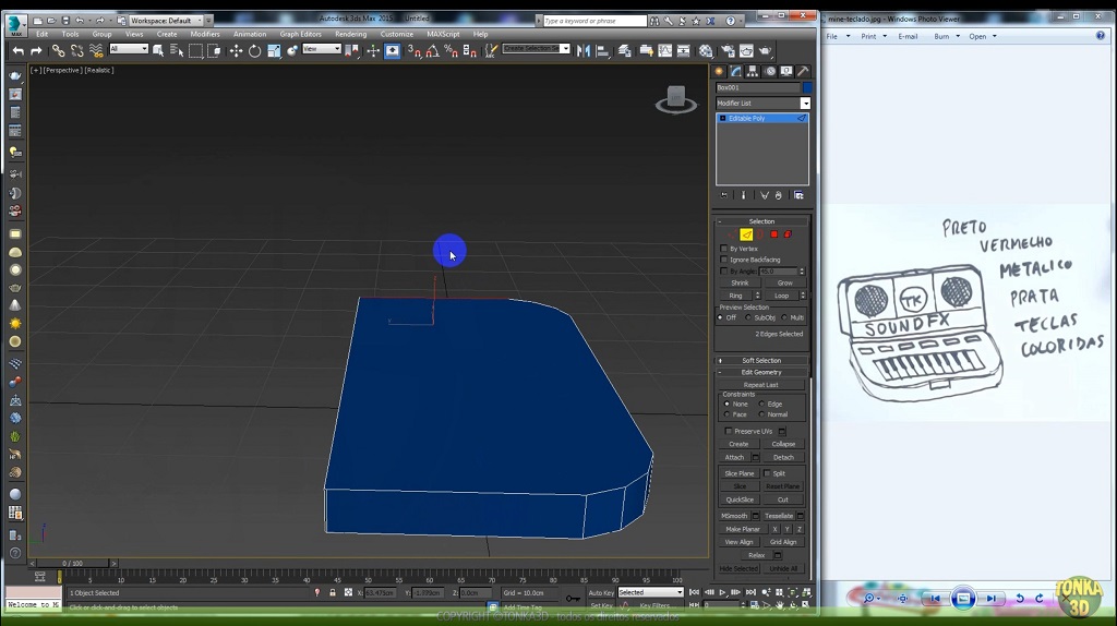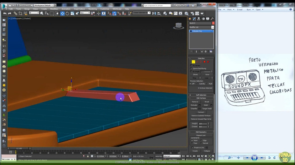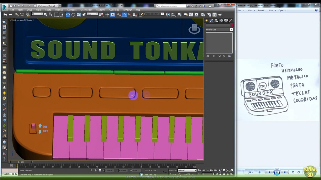 Usando técnicas simples de modelagem 3D, vamos criando o modelo, sempre deixando a referência do lado para ter uma base de tamanho, proporção etc.