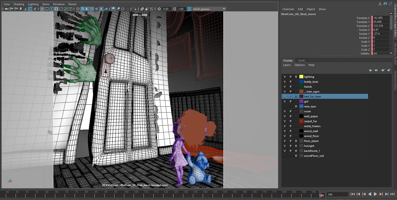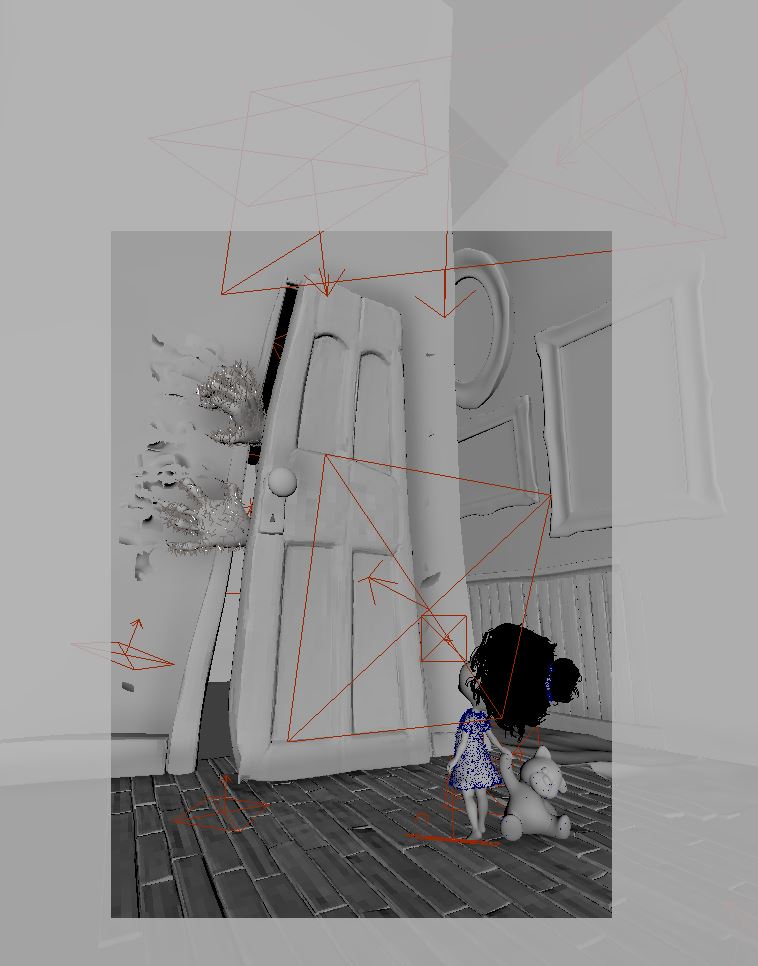 Meu próximo passo é montar a luz principal da cena. Na cena do pesadelo, a luz principal é a luz atrás da garota que aponta para a porta. Depois da luz da tecla, eu movo para pular, encher e iluminar a luz – todos os personagens e acessórios principais parecem mais interessantes se eles tiverem um toque de luz na borda! Eu obtenho os melhores resultados quando a luz do meu aro e a da chave têm temperaturas opostas.