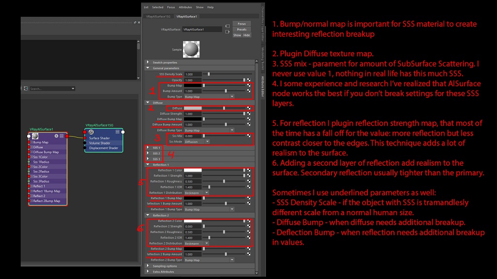 Meu shader favorito para a Sub Superfície é o AlSurface. Percebi que obtém os melhores resultados se eu não tocar em nenhuma das configurações de camadas do SSS e só inserir um mapa difuso e ajustar os valores de mixagem do SSS. (A mixagem SSS nunca deve ser 1, porque mesmo uma vela de cera não tem tanta translucidez.) Os mapas mais importantes são bump, reflection e gloss; esses são os mapas que criam magia para uma pele realista.
