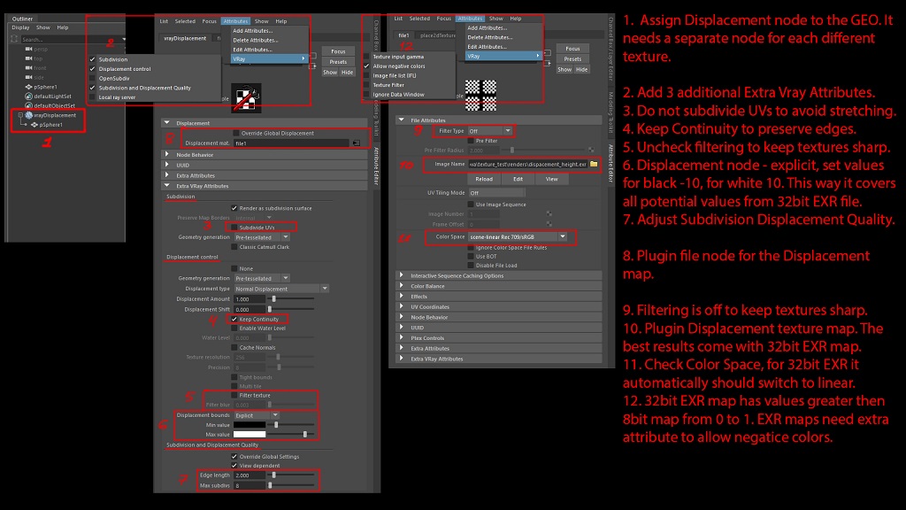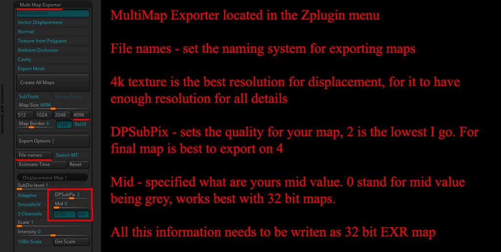 Para que o displacement funcione corretamente, você precisa de mapas corretos do Zbrush, as configurações estão na imagem abaixo: