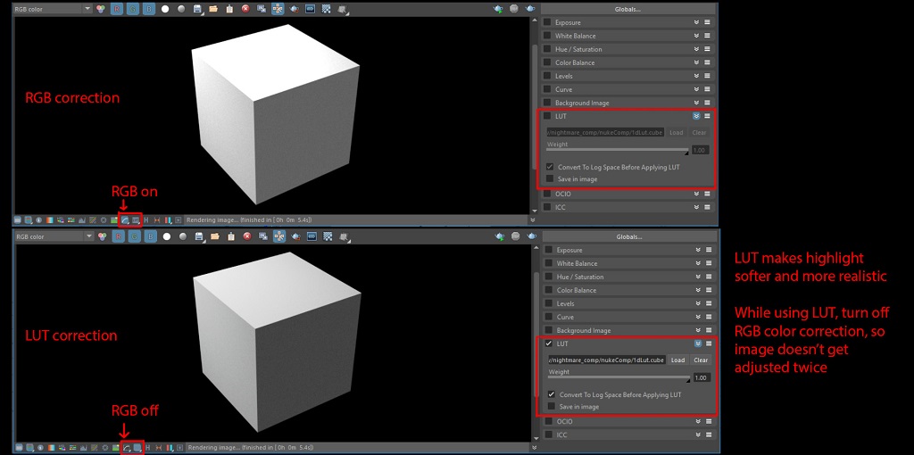 Na composição final dos meus projetos, gosto de usar o LUT, que é uma configuração de correção de cores que cria o equilíbrio de cores desejado para a imagem e evita que os valores de branco ultrapassem 1. Por vezes, pode alterar o contraste e balanço preto / branco da imagem, por isso prefiro usar o LUT desde o início um projeto. Eu conecto-o na visualização de renderização para visualizar o render com LUT. Não assa no arquivo EXR. Para retornar a renderização ao equilíbrio de cores desejado, a LUT precisa ser aplicada no Nuke e no final da rede.